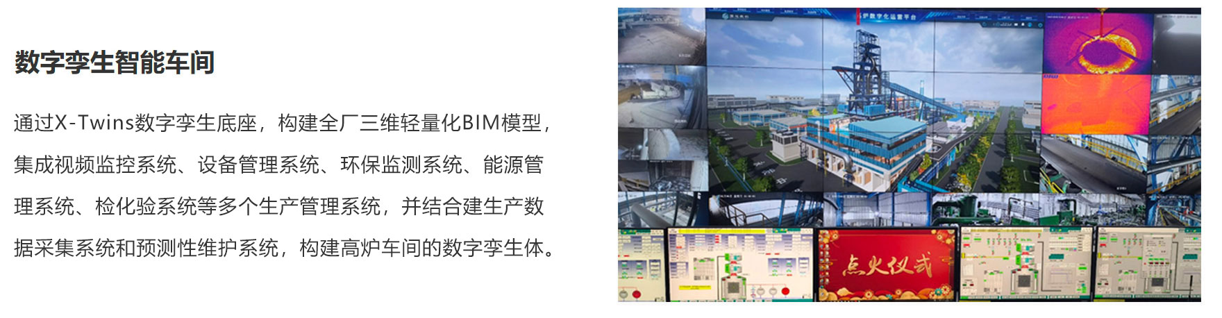 某鋼鐵集團高爐數(shù)字孿生車間,通過X-Twins數(shù)字孿生底座,構(gòu)建全廠三維輕量化BIM模型,并通過集成監(jiān)控系統(tǒng),設(shè)備管理系統(tǒng),環(huán)保監(jiān)測系統(tǒng),能源管理系統(tǒng),檢化驗系統(tǒng),并集成新建生產(chǎn)數(shù)據(jù)采集系統(tǒng)和預(yù)測性系統(tǒng)等多個生產(chǎn)管理系統(tǒng)構(gòu)建高爐車間的數(shù)字孿生體。通過該數(shù)字孿生體為高爐生產(chǎn)帶來如下價值: